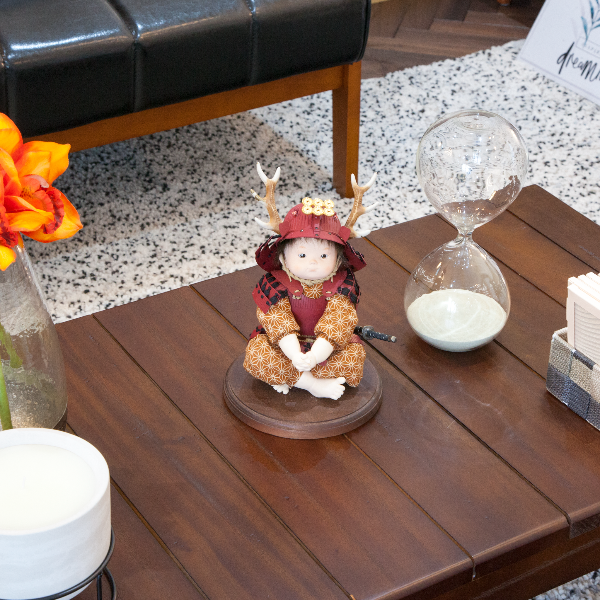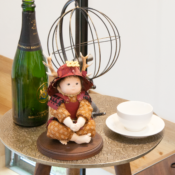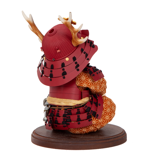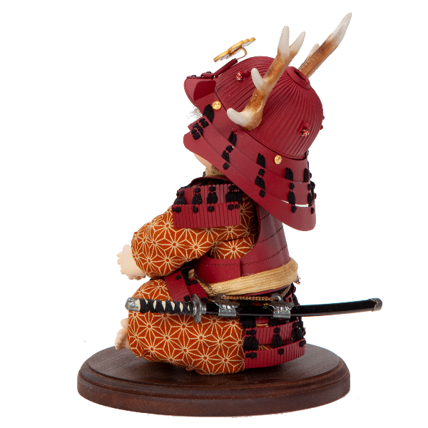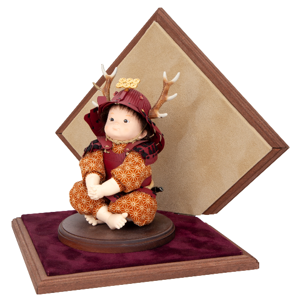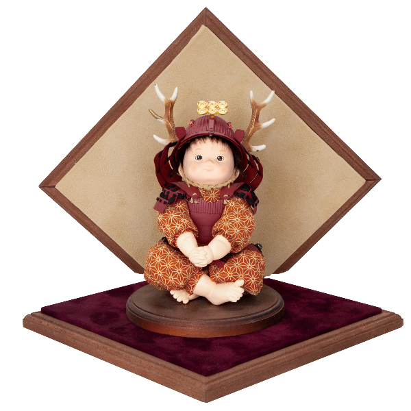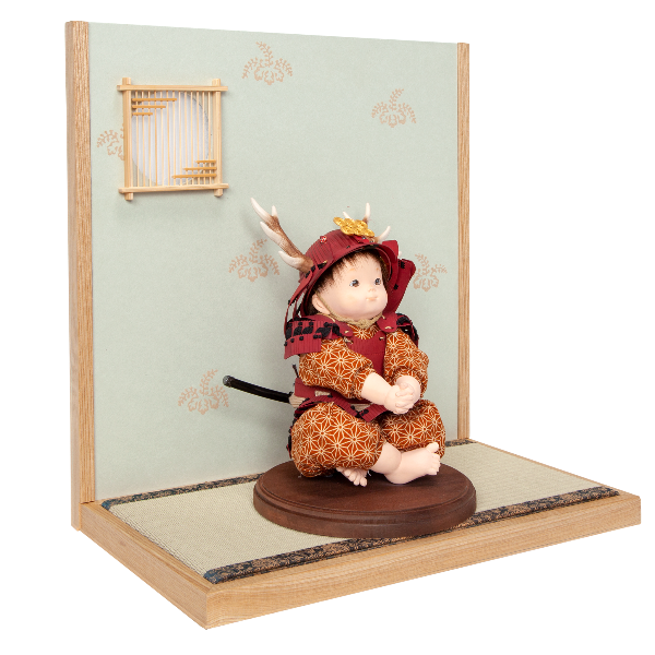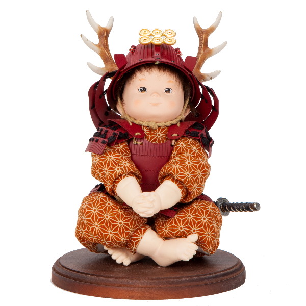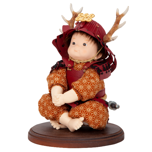 微笑む柔らかな表情に、渋い艶消しの鎧を着た、落ち着いた印象の人形です。