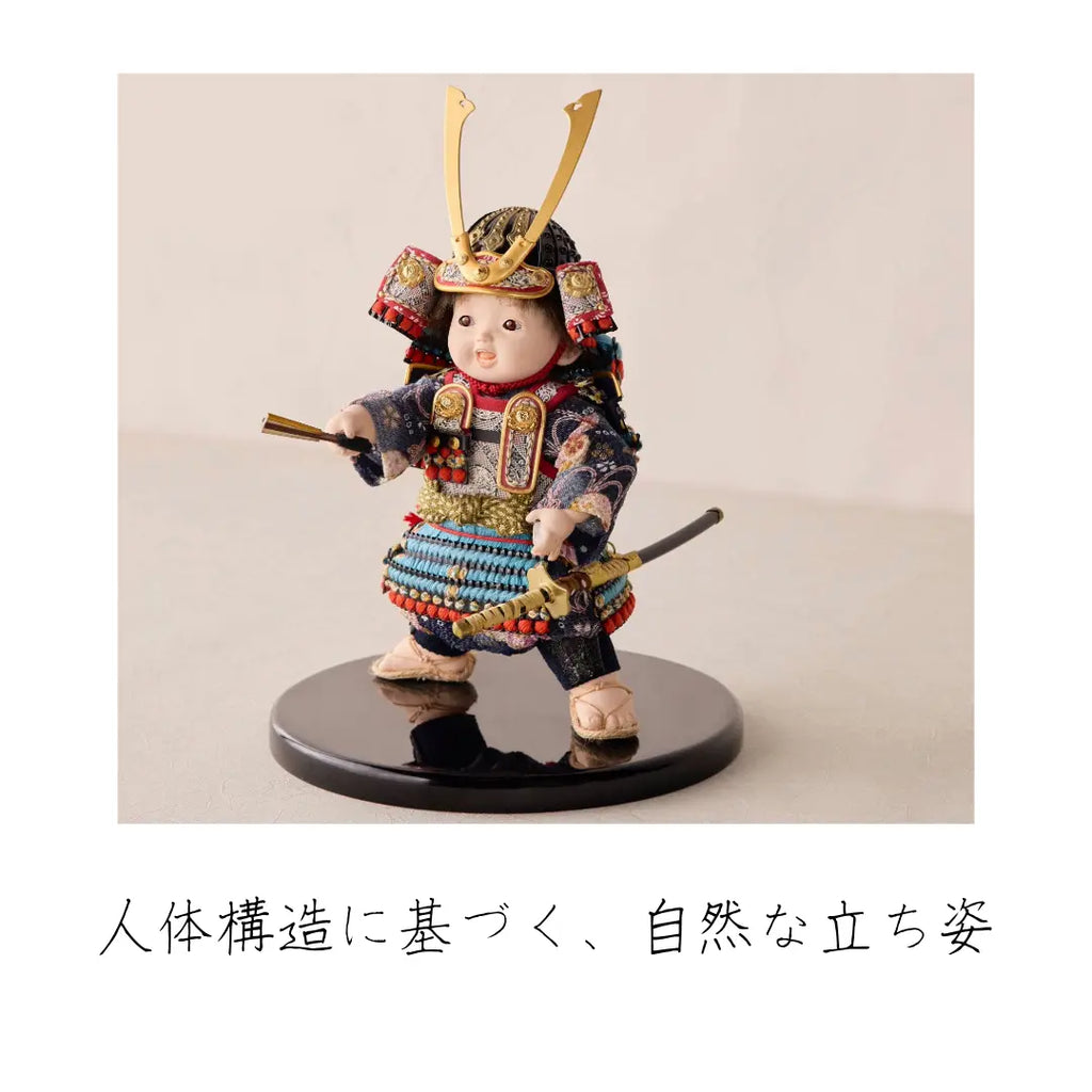 あざやかな浅葱色の大鎧をまとった翔くん。腰に刀を差し、手に扇子を持つ姿は堂々としながらも、乳歯をのぞかせた少しやんちゃな笑顔が愛らしい印象です。入れ目で仕上げた瞳や柔らかな造形が、幼いふくよかさとわんぱくさを引き立てる、躍動感あふれる節句飾りです。