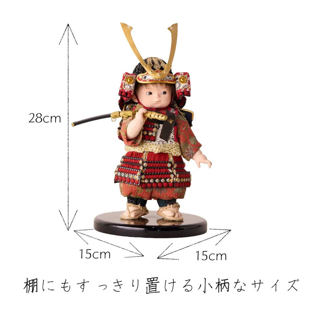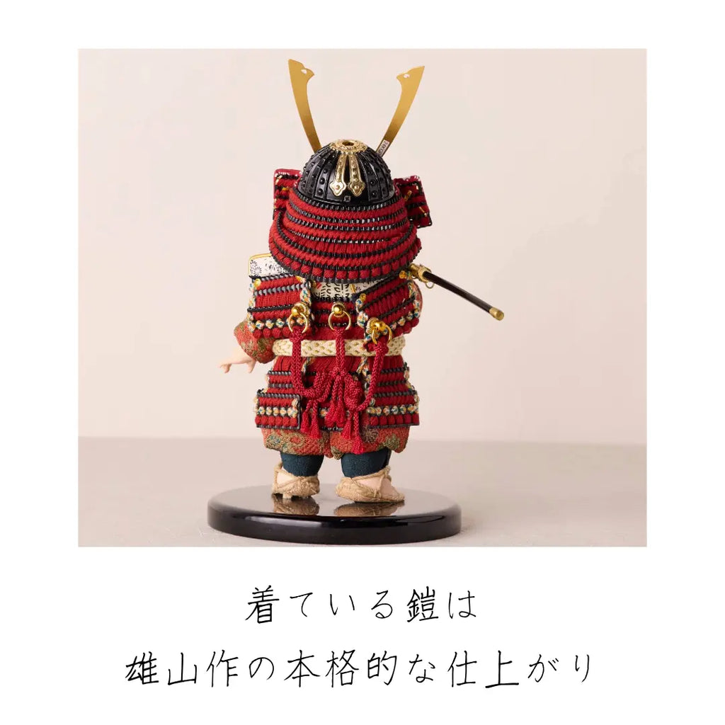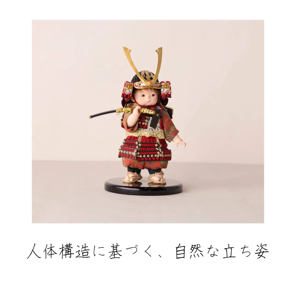 国宝・赤糸威をモチーフに製作した胴丸鎧をまとい、凛とした表情を見せる子ども大将。幼さの中にも勇敢さと誇りを感じさせる立ち姿が印象的です。精緻な造形と端正な顔立ちが調和し、伝統美と力強さを併せ持つ、節句にふさわしい人形です。