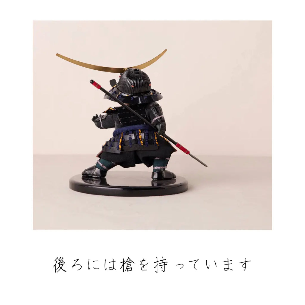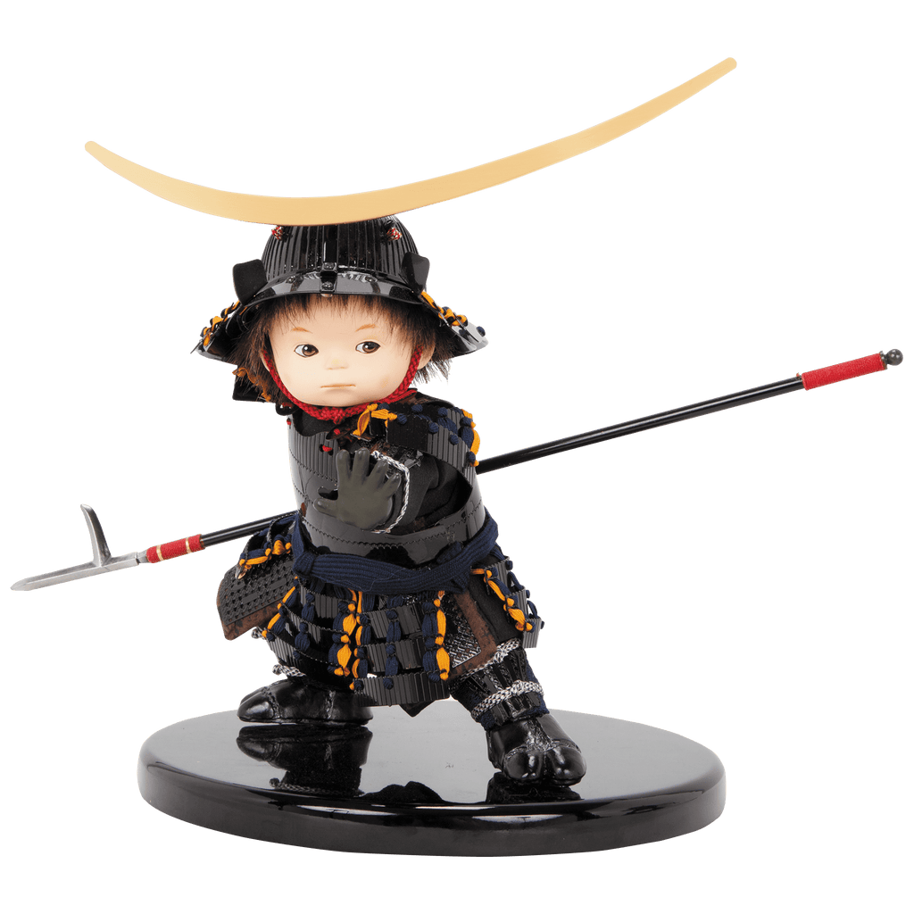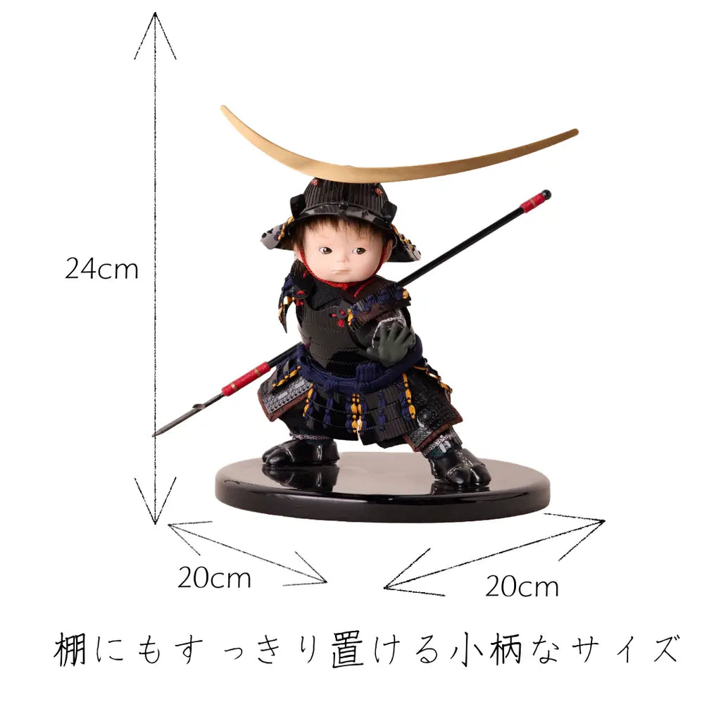 伊達政宗の象徴である大きな三日月前立と、黒で統一された鎧をまとった子ども大将です。槍を手に、歌舞伎の見得を思わせる勇ましいポーズをとりながらも、愛らしさを感じさせる表情が魅力。書き目で仕上げた瞳や柔らかな造形に、幼いわんぱくさと気高さが調和した、存在感ある節句飾りです。