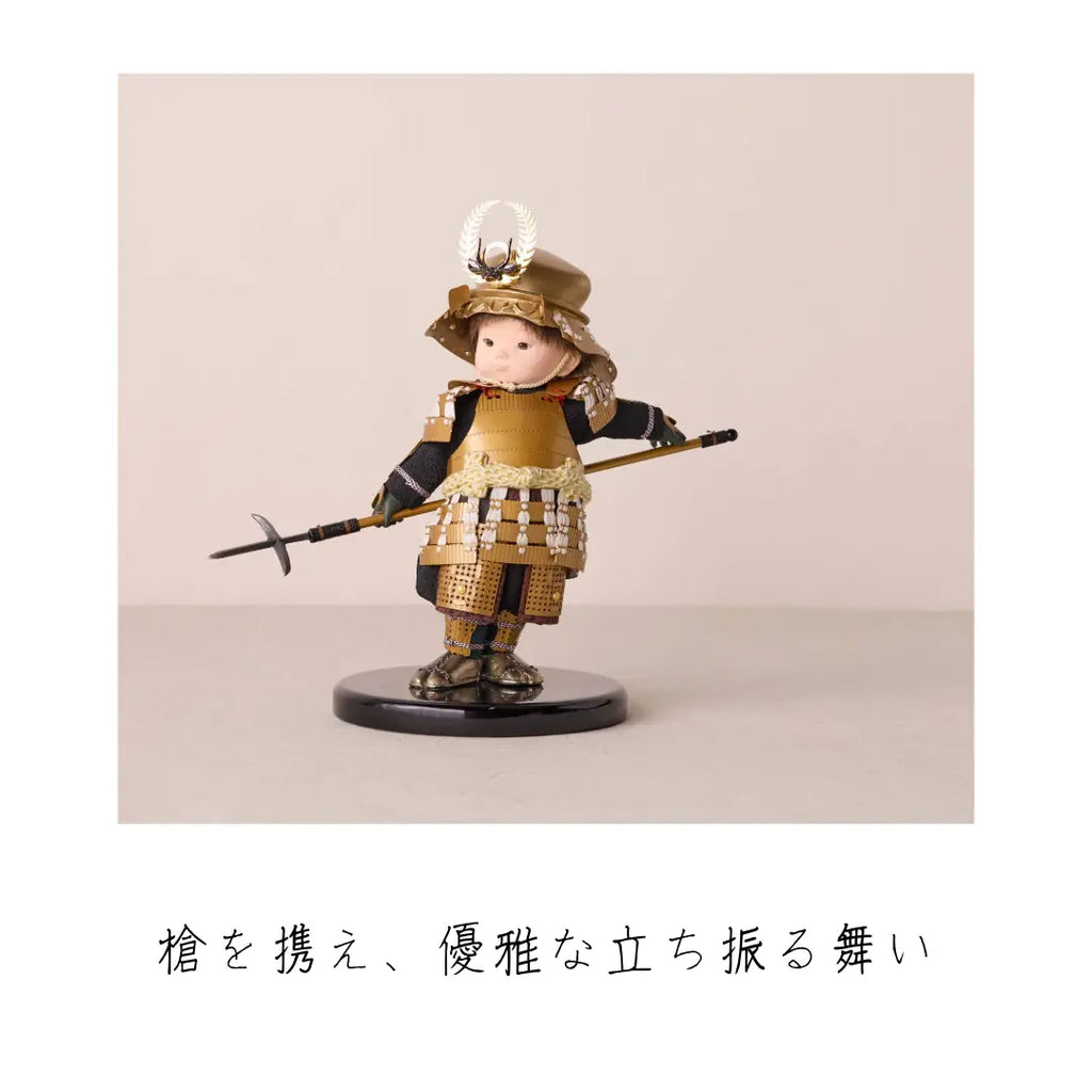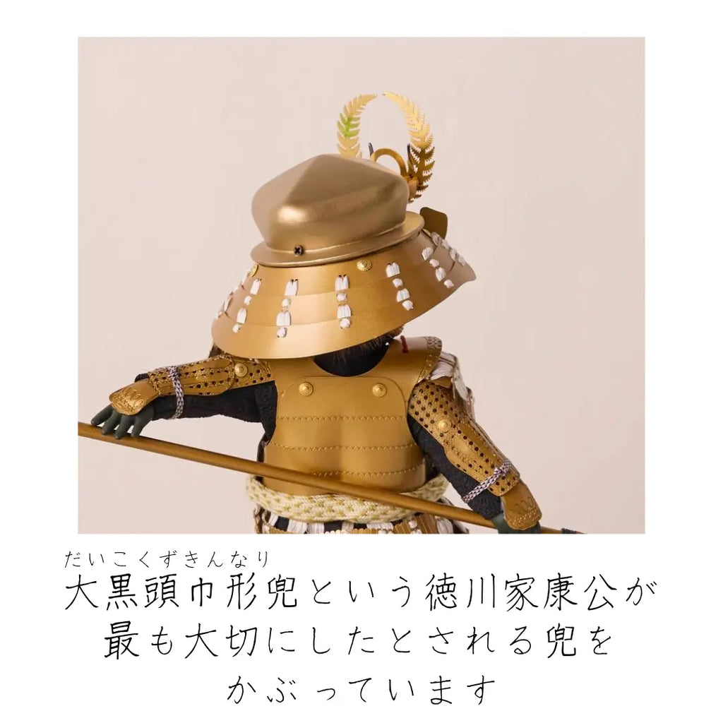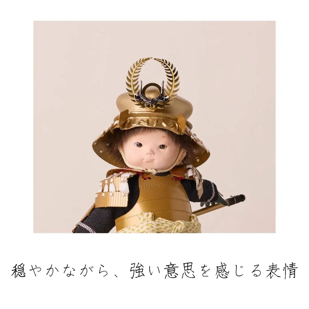金色に輝く華やかな鎧をまとい、兜は大黒天の頭巾、前立てには繁栄と長寿を象徴するシダの葉をあしらった徳川家康モチーフの子ども大将です。穏やかでありながら威厳ある表情が印象的で、手描きで仕上げた瞳や柔らかな造形がわんぱくさを引き立てます。知恵と強運に恵まれた家康公のように、賢く逞しく育ってほしいという願いを込めた節句飾りです。