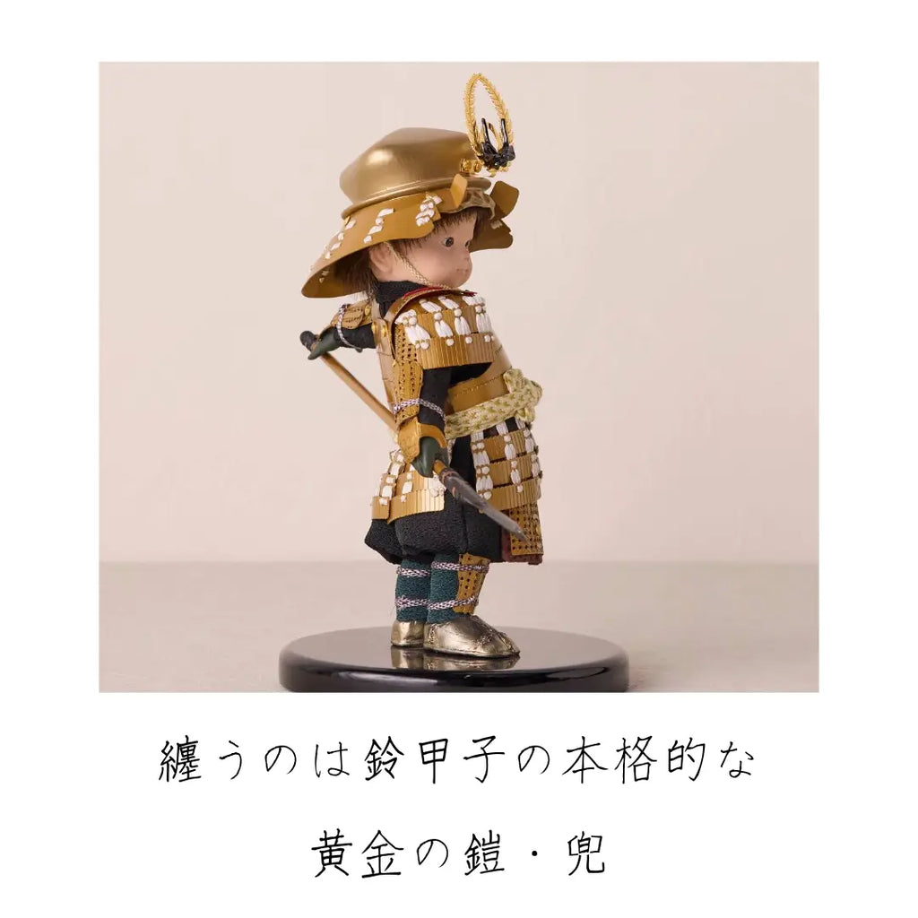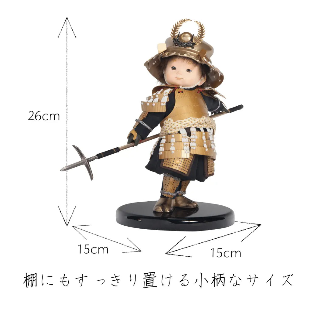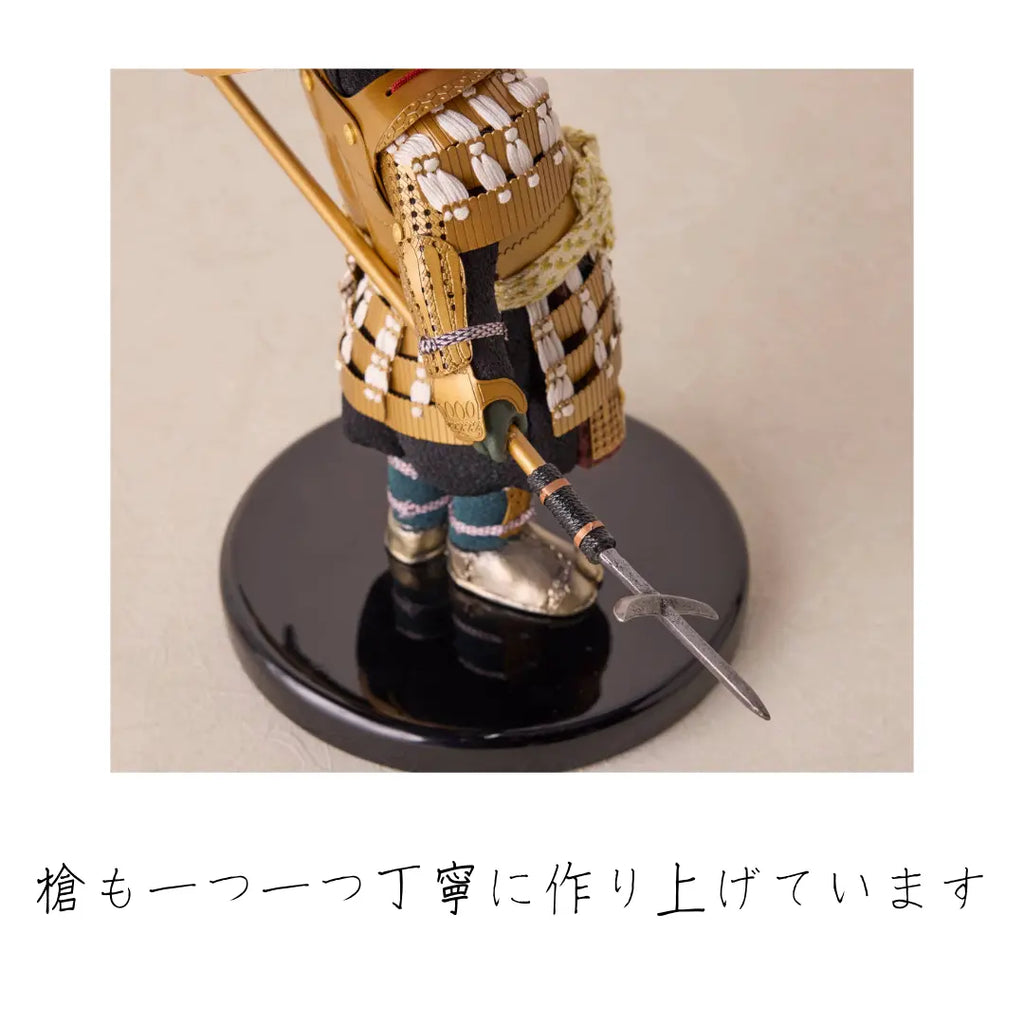 金色に輝く華やかな鎧をまとい、兜は大黒天の頭巾、前立てには繁栄と長寿を象徴するシダの葉をあしらった徳川家康モチーフの子ども大将です。穏やかでありながら威厳ある表情が印象的で、手描きで仕上げた瞳や柔らかな造形がわんぱくさを引き立てます。知恵と強運に恵まれた家康公のように、賢く逞しく育ってほしいという願いを込めた節句飾りです。