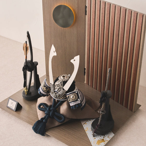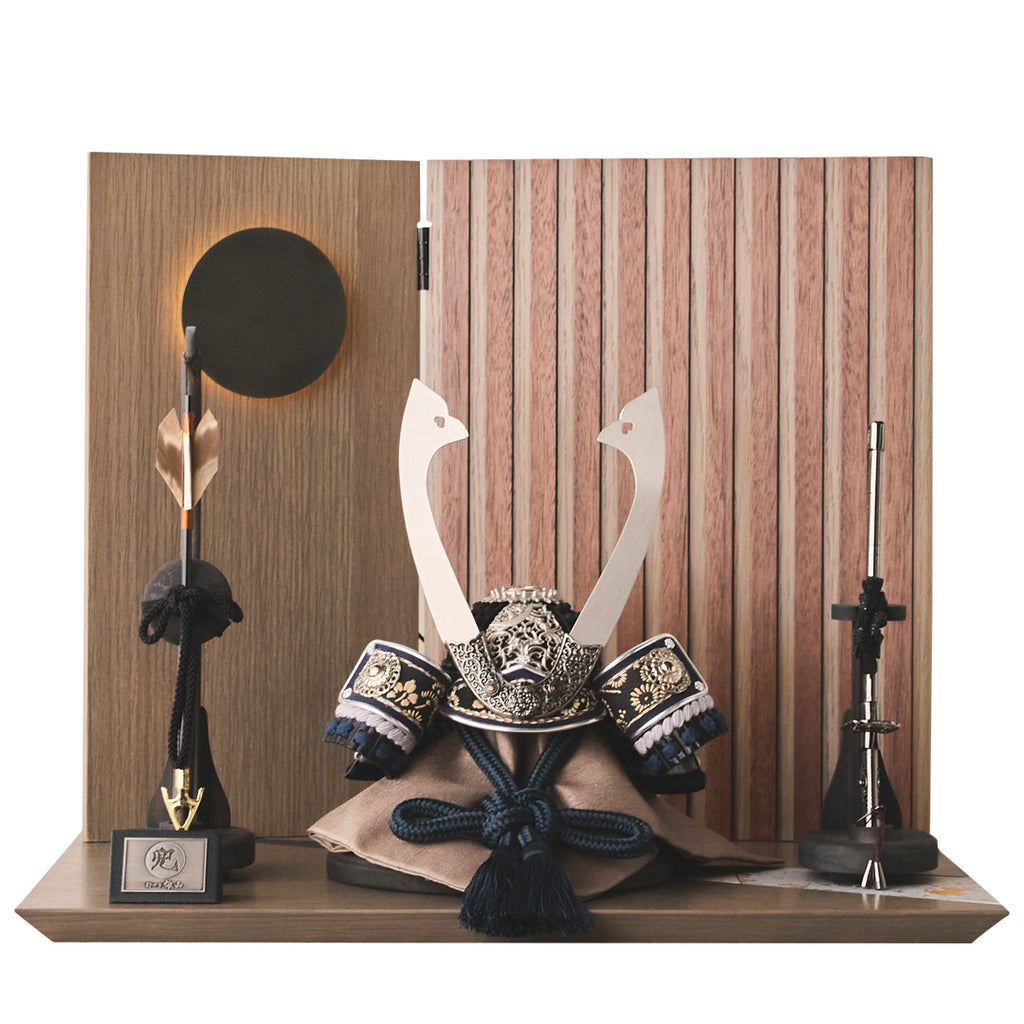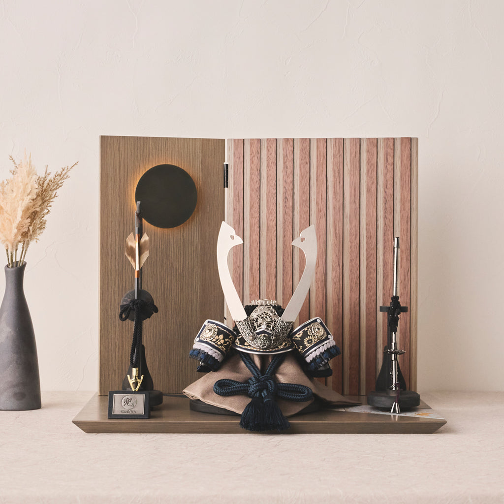 漆黒の艶消し塗装を施した、シックな印象の兜飾り