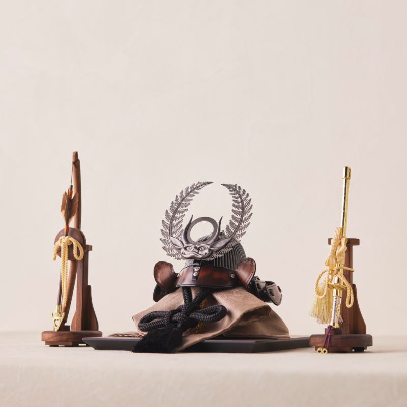 革と甲冑、異なるふたつの職人技を融合して製作した作品です。 本革のもつ落ち着いた色合いと質感は、おうちのインテリアと調和し、節句人形を飾る楽しみを与えてくれます。 徳川家康公の歯朶(しだ)の前立てを銀ブロ仕立てでデザインしました。 オプションとして弓太刀もご用意しており、全体的にコンパクトな作品となっております。