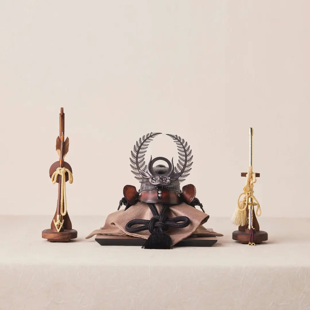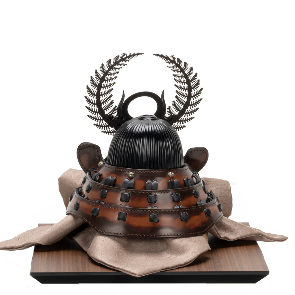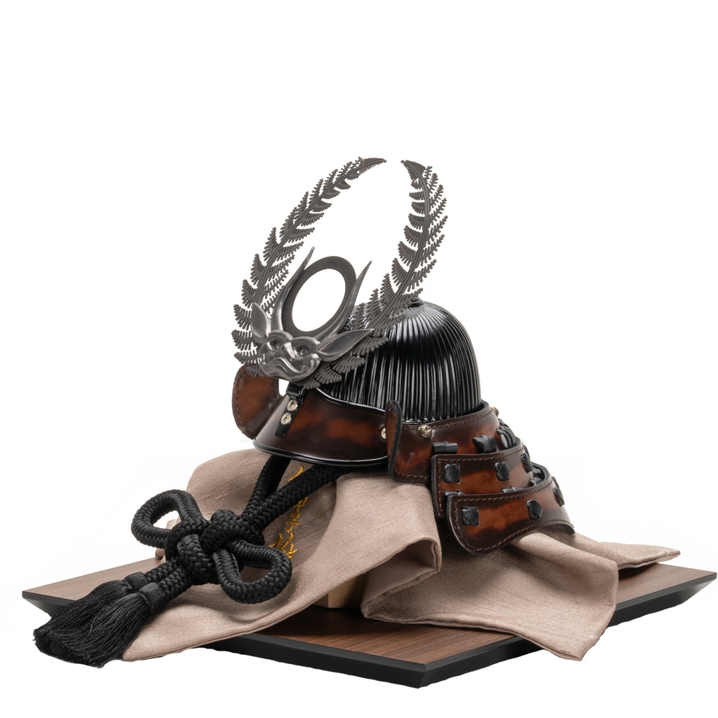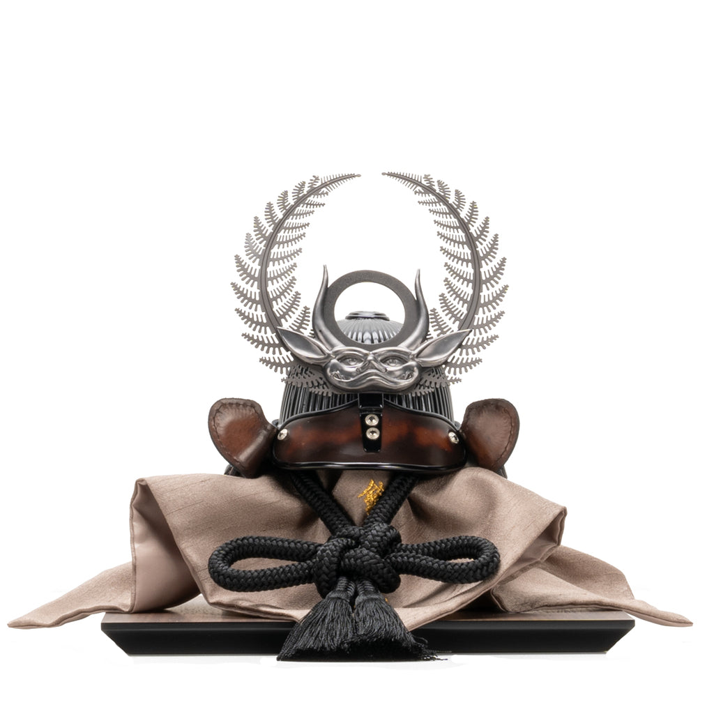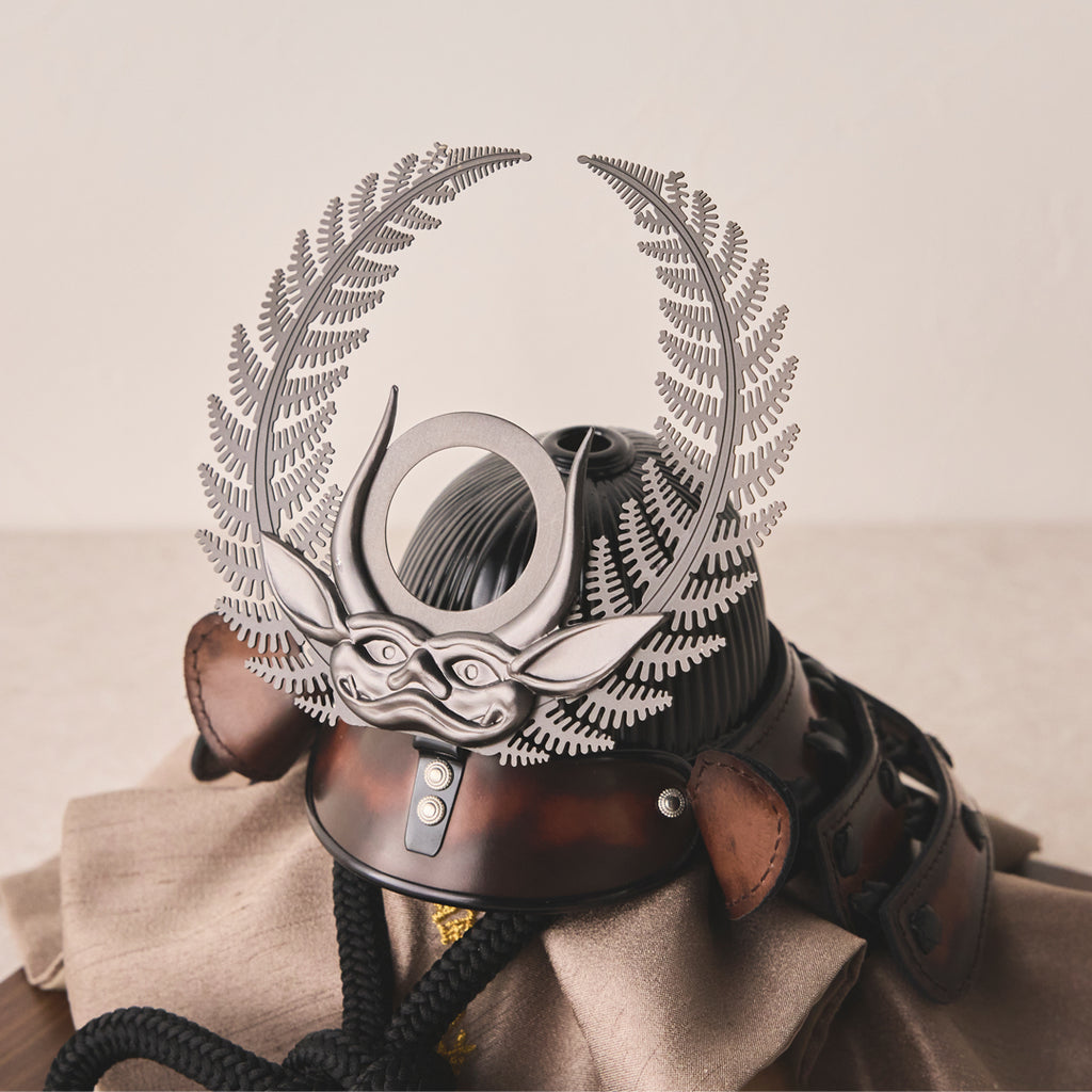 革と甲冑、異なる職人技を融合させた作品です。 本革の落ち着いた色合いと質感がインテリアに馴染み、節句を彩ります。 徳川家康公の歯朶の前立てを銀ブロで仕立てた現代的でコンパクトな一作です。