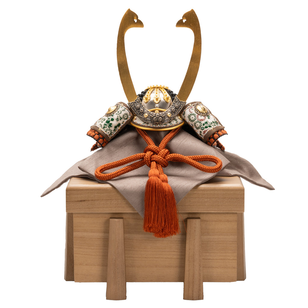 白を基調に淡いナチュラルな色合いの兜飾り