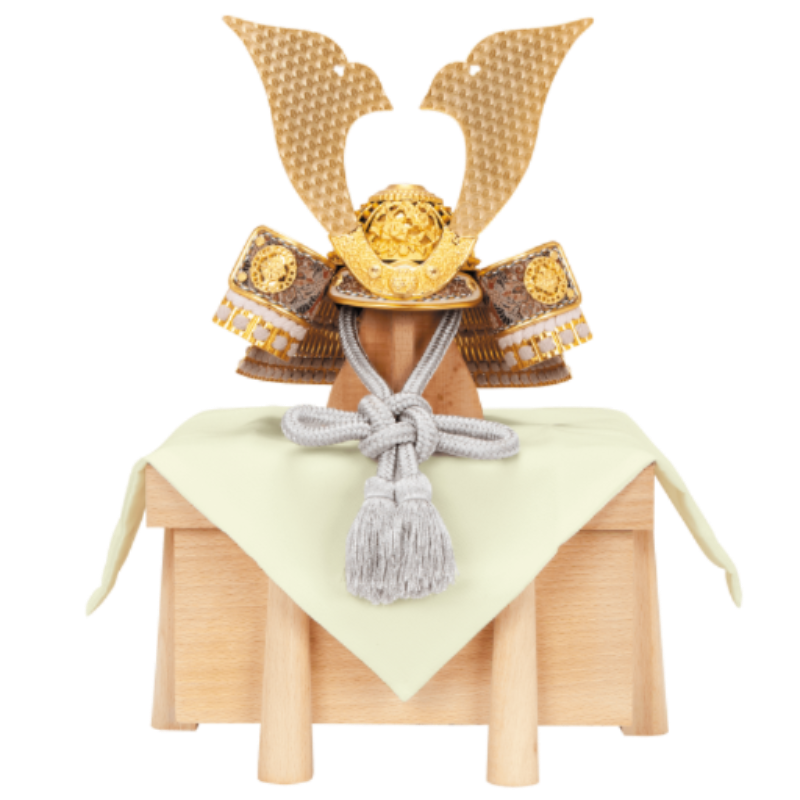 天賦之兜「華」は、白を基調に薄い紅の糸で威した、優雅で柔らかな印象の兜飾りです。 吹き返しと眉庇には龍村織物を用いて重厚感を加え、立体的な正倉院文様の金具が格調と華やかさを引き立てます。