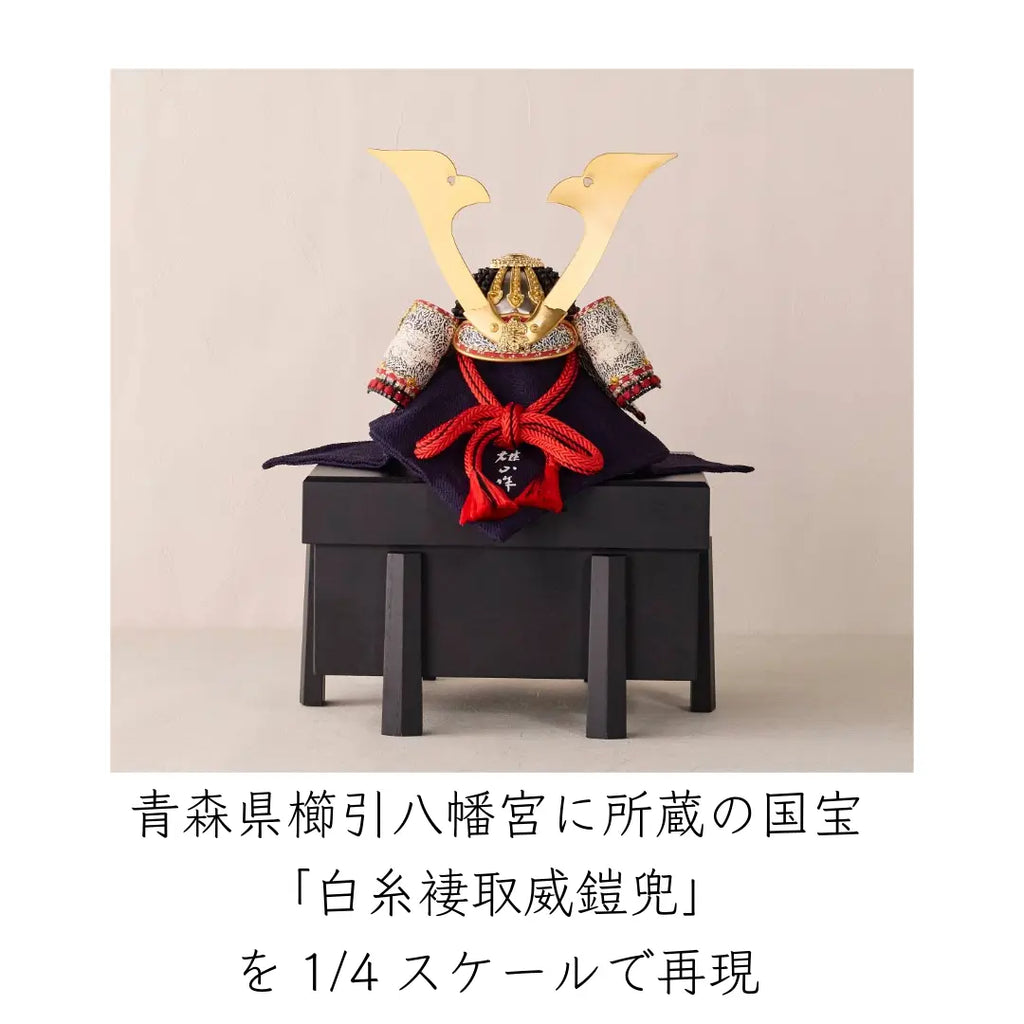 青森県の櫛引八幡宮に奉納されている国宝2領のうちの一つ「白糸褄取威鎧」(もう1領は「菊一文字の鎧兜」)は、白糸を卯の花に見立て別名「卯の花威」と呼ばれています。国宝模写シリーズの中で、より端正な美しさを味わうことのできる作品です。鈴甲子雄山が1/4スケールで再現しました。