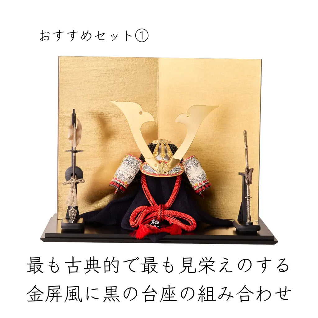 上記価格は兜の櫃飾りの値段になります。櫃飾りとはお櫃の上に兜をのせた最もシンプルな飾り方のことで、付属品として収納するためのお櫃、袱紗、兜を乗せる芯木、作家札がつきます。
