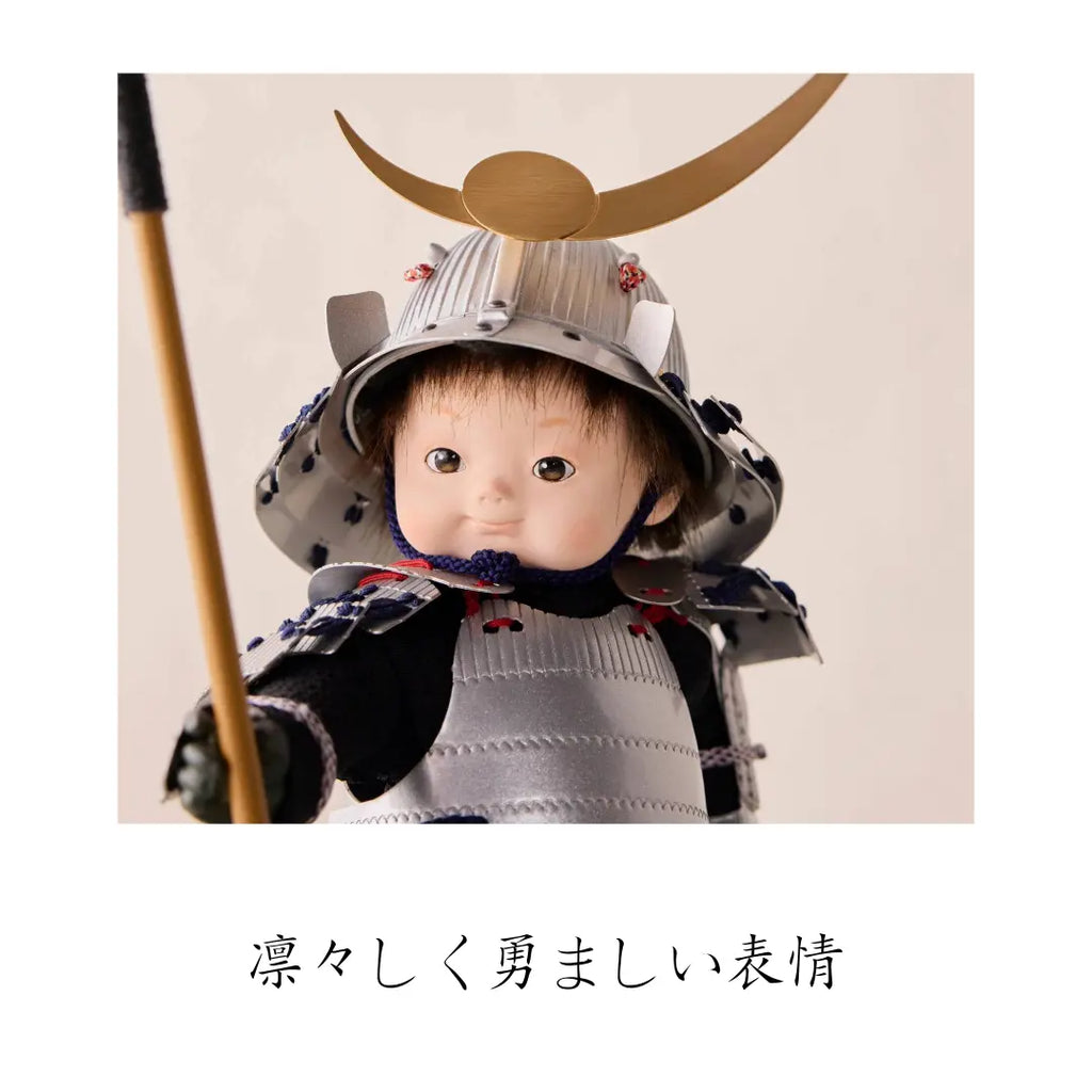シルバーの鎧をまとい、月と太陽を象った日月前立を掲げた上杉謙信モチーフの子ども大将です。穏やかに微笑む表情の中に勇ましさと気高さを宿し、手描きで仕上げた瞳や柔らかな造形がわんぱくな魅力を引き立てます。義を重んじた謙信公のように、思いやりと強さを兼ね備えた子に育つ願いを込めた節句飾りです。