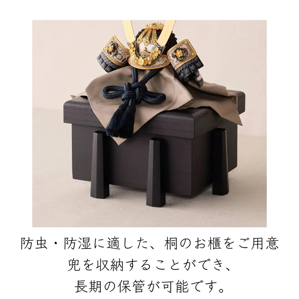 上記価格は兜の櫃飾りの値段になります。櫃飾りとはお櫃の上に兜をのせた最もシンプルな飾り方のことで、付属品として収納するためのお櫃、袱紗、兜を乗せる芯木、作家札がつきます。