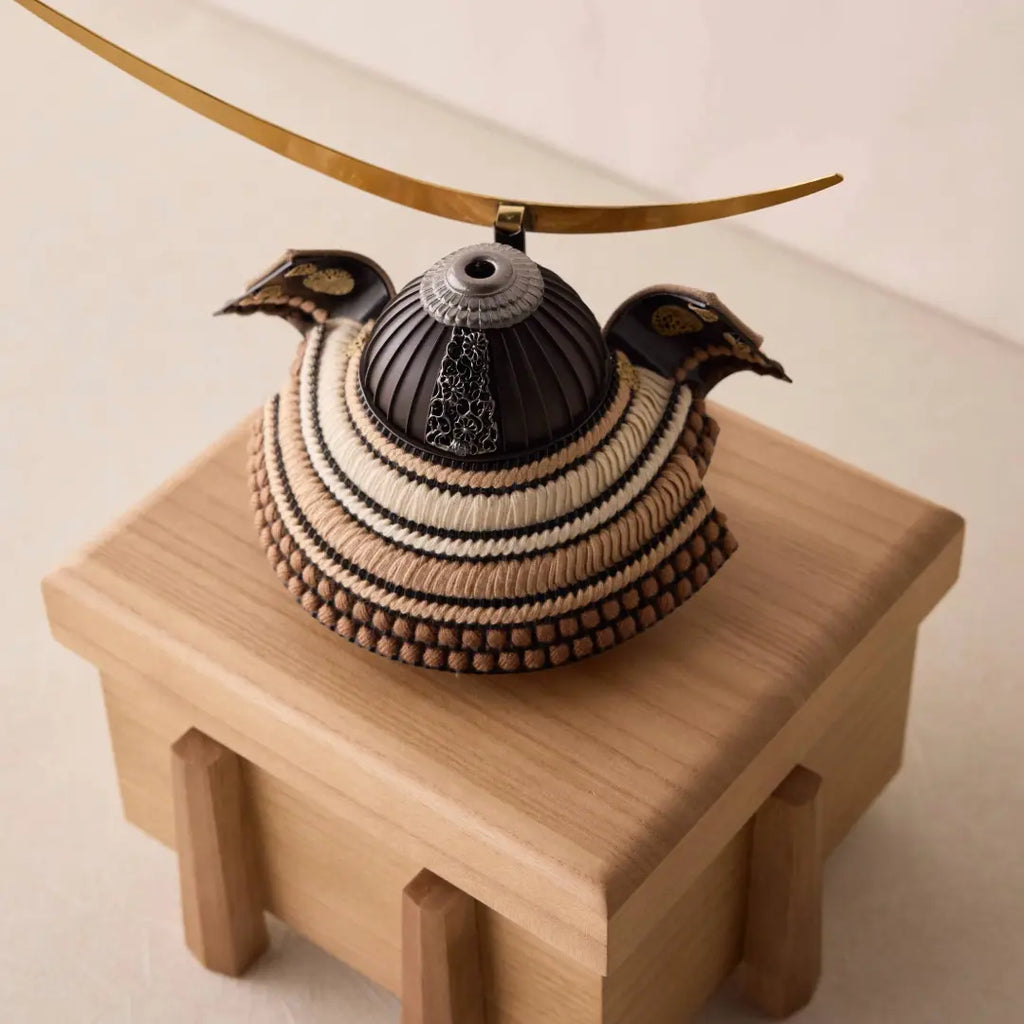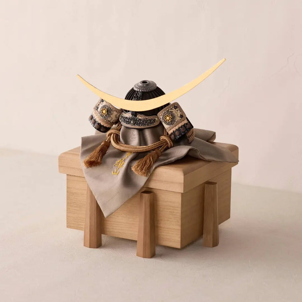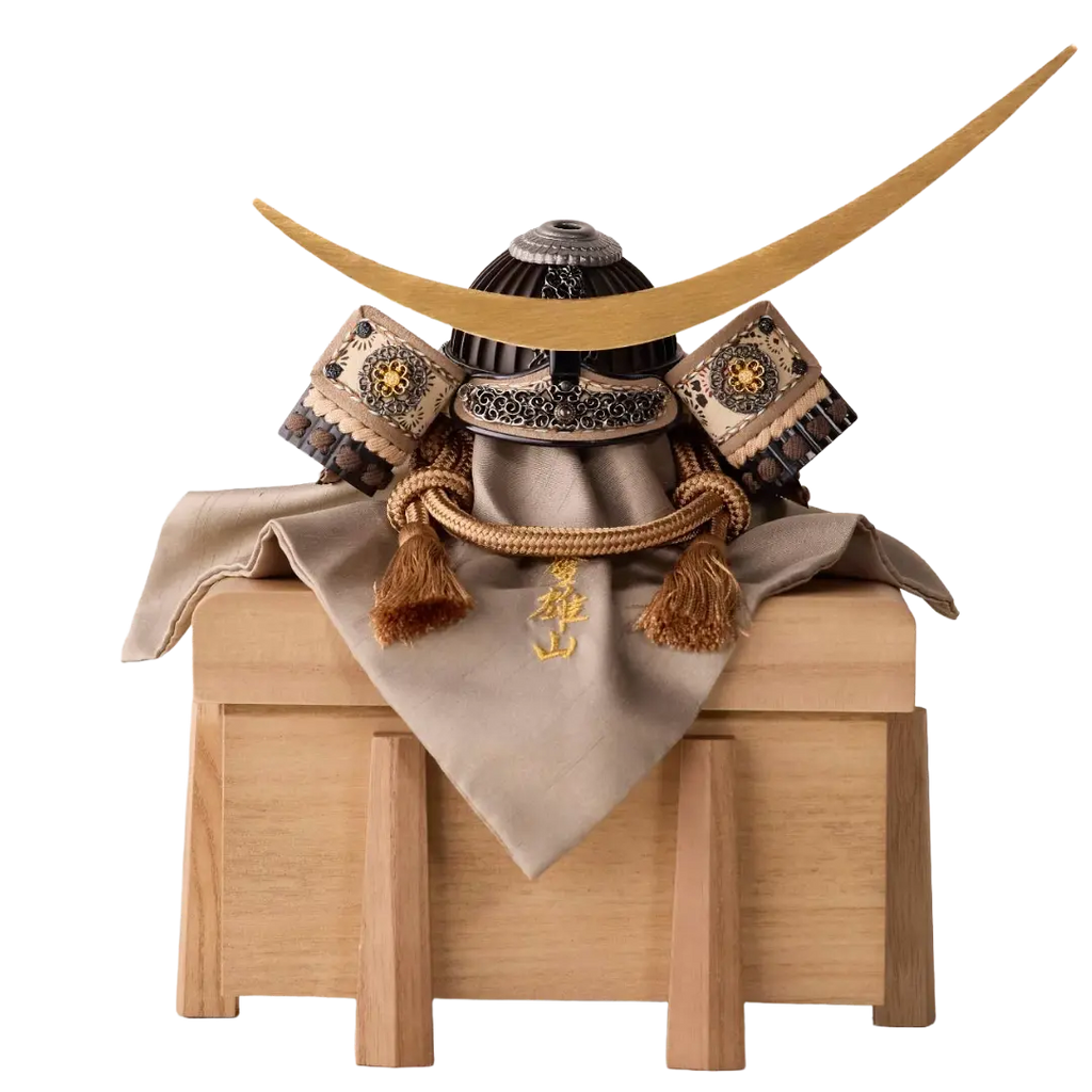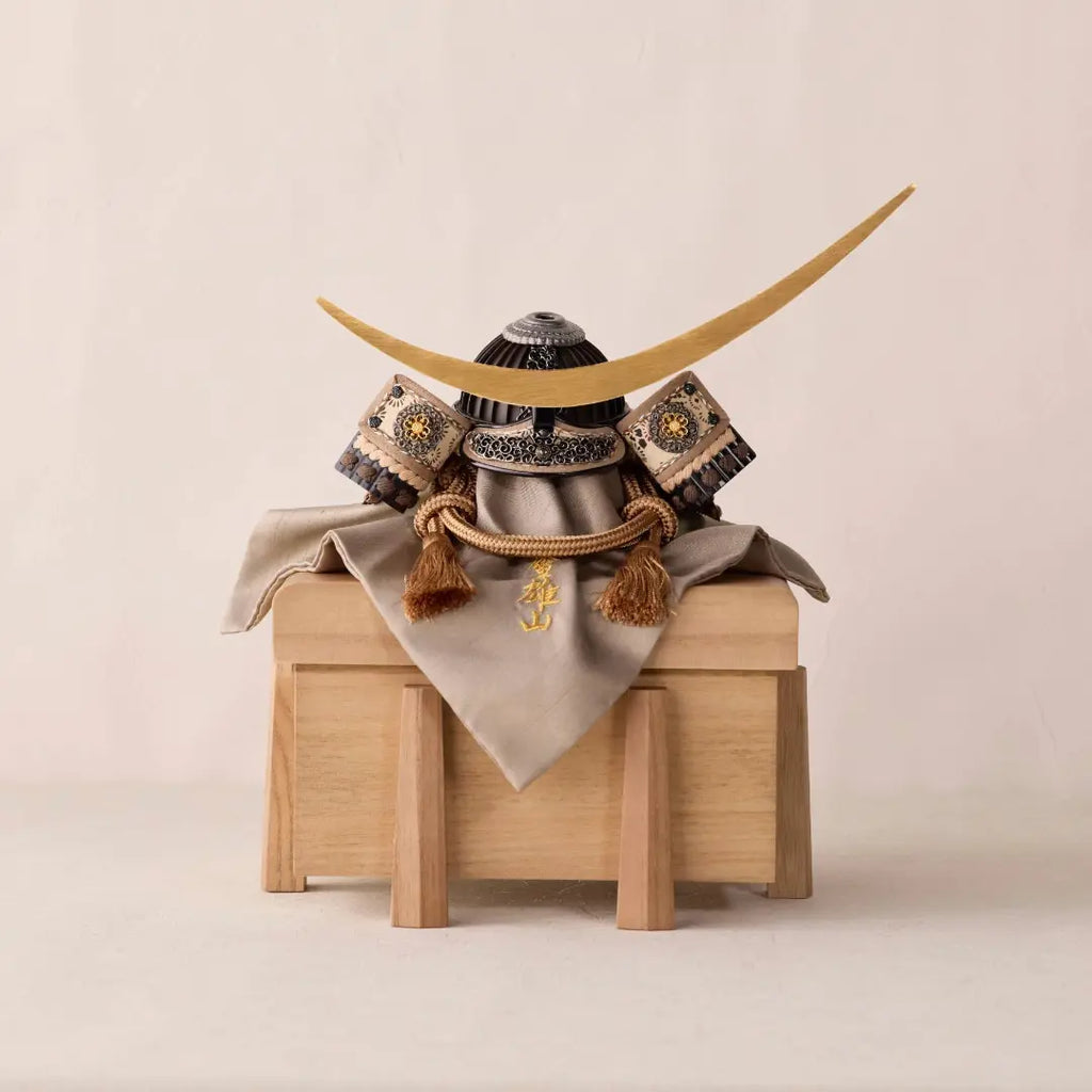 「天賦の兜 三日月」は、インテリアに馴染むやさしい色調を基調とした天賦シリーズの一作です。象徴的な三日月の前立をあしらい、茶やベージュで統一された配色が落ち着きと温かみを演出。伝統の兜飾りに現代的な感性を融合させ、お子さまの成長を見守る品格ある節句飾りに仕上げました。