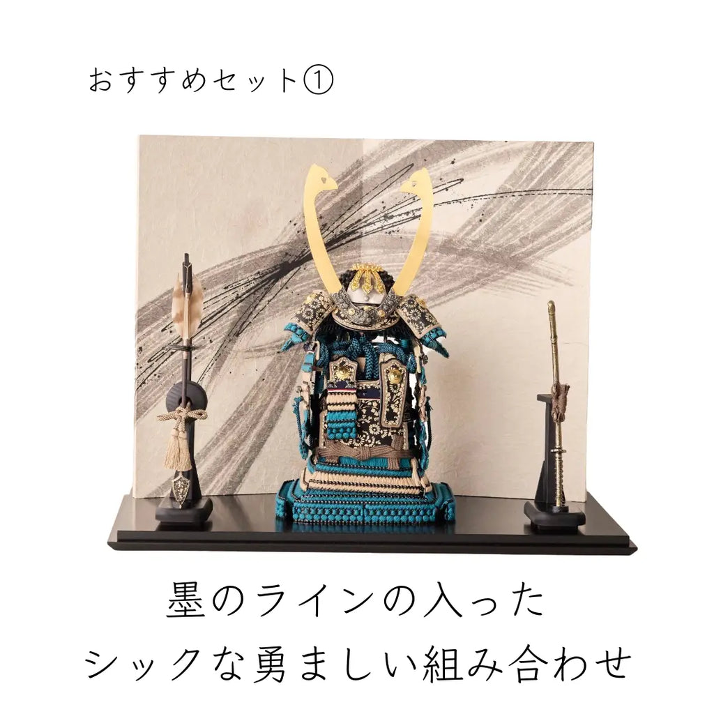 - おすすめセット②:40cmの幅の台座に箔押しの屏風を背景にした飾り(弓太刀付)
