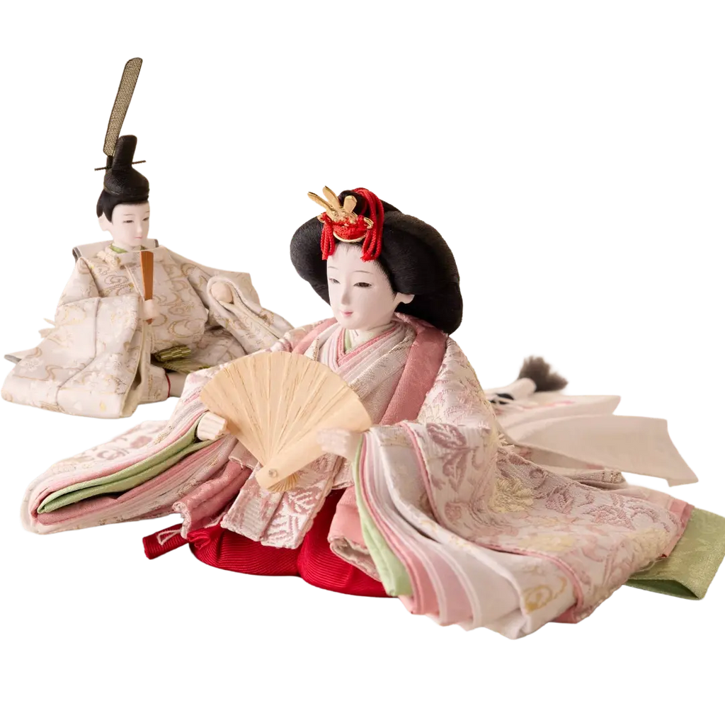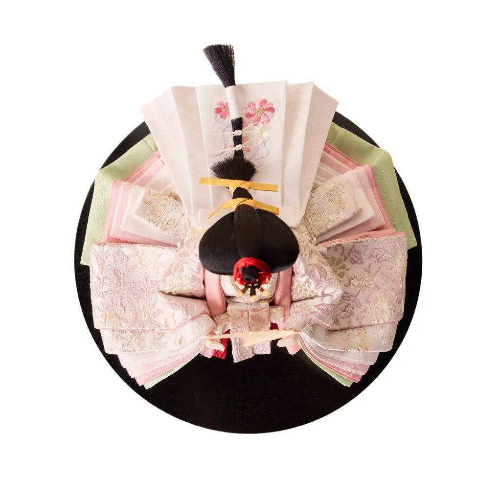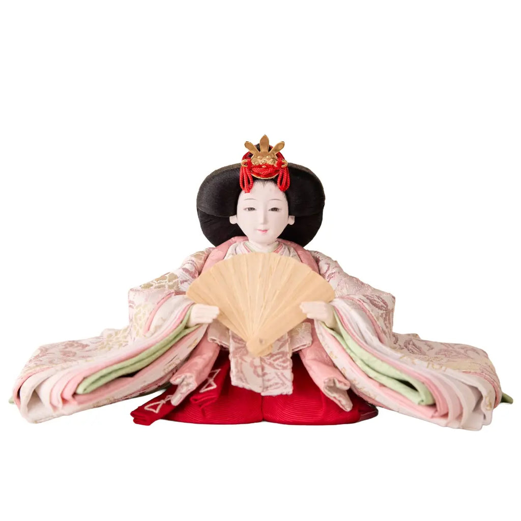大人びた、柔らかな表情の雛人形「まどか」。春の陽気が差し込む桃の節句にふさわしい衣装の色合わせをご用意しました。冬の白さがだんだんと色づいていく様を白の衣装の下に桃色、薄緑と重ねることで、季節の装いを感じさせてくれます。