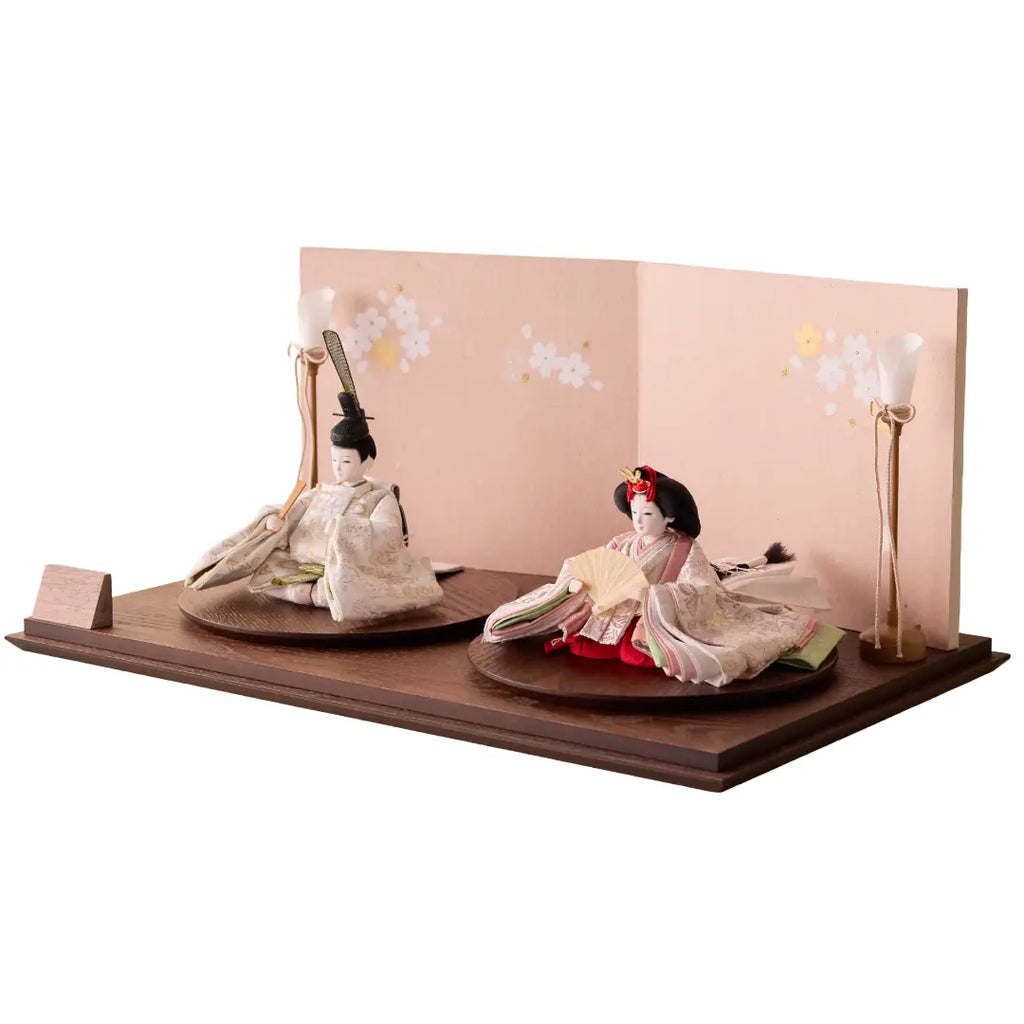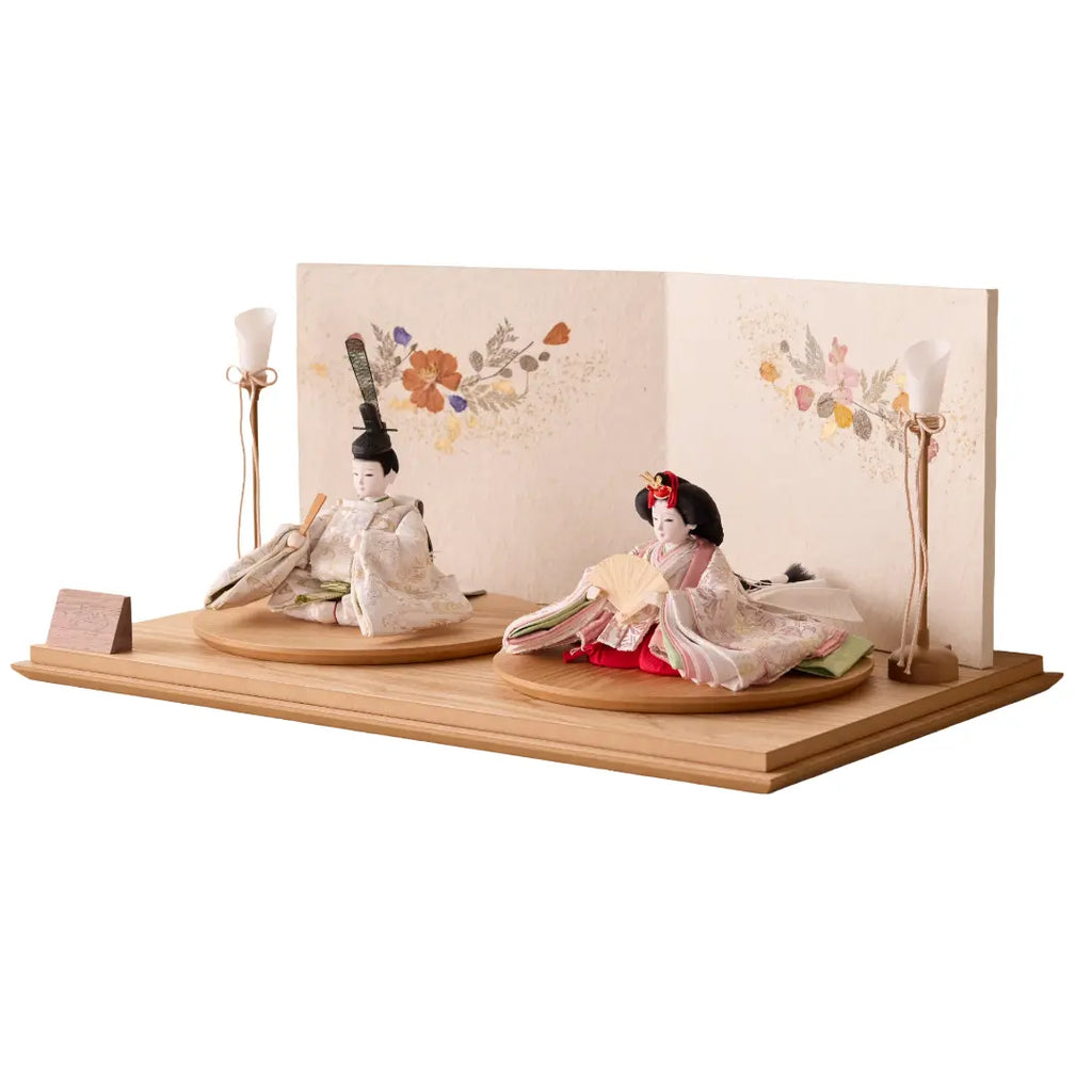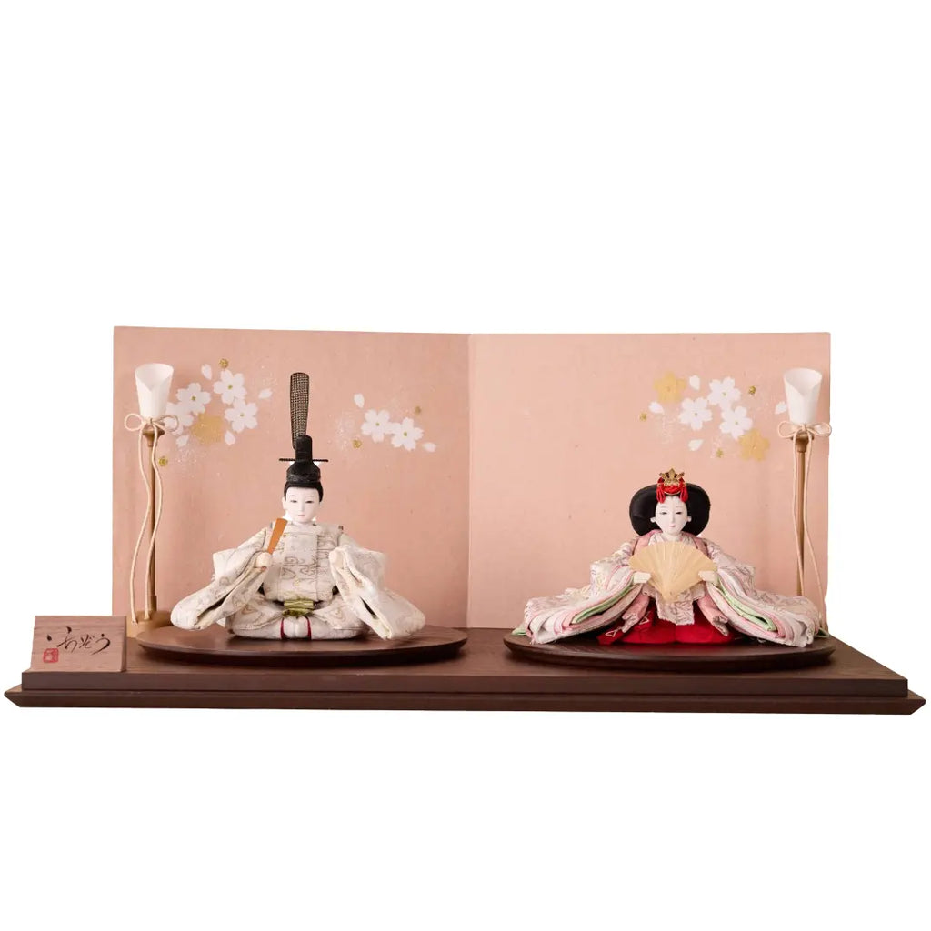 大人びた、柔らかな表情の雛人形「まどか」。春の陽気が差し込む桃の節句にふさわしい衣装の色合わせをご用意しました。冬の白さがだんだんと色づいていく様を白の衣装の下に桃色、薄緑と重ねることで、季節の装いを感じさせてくれます。