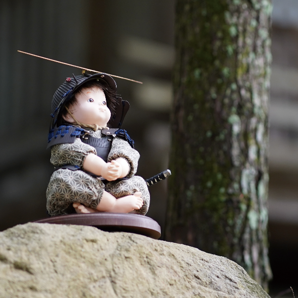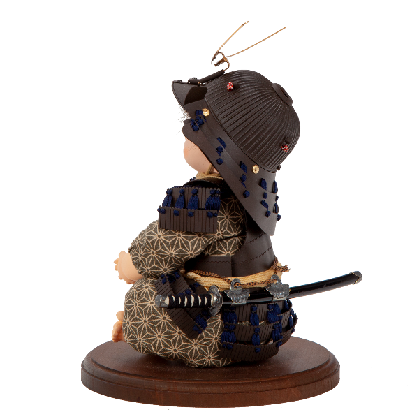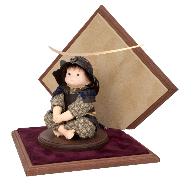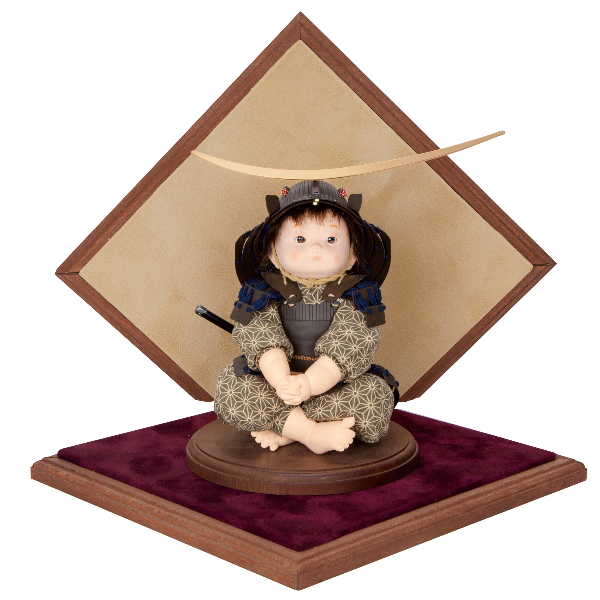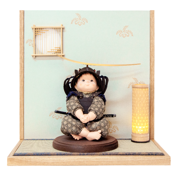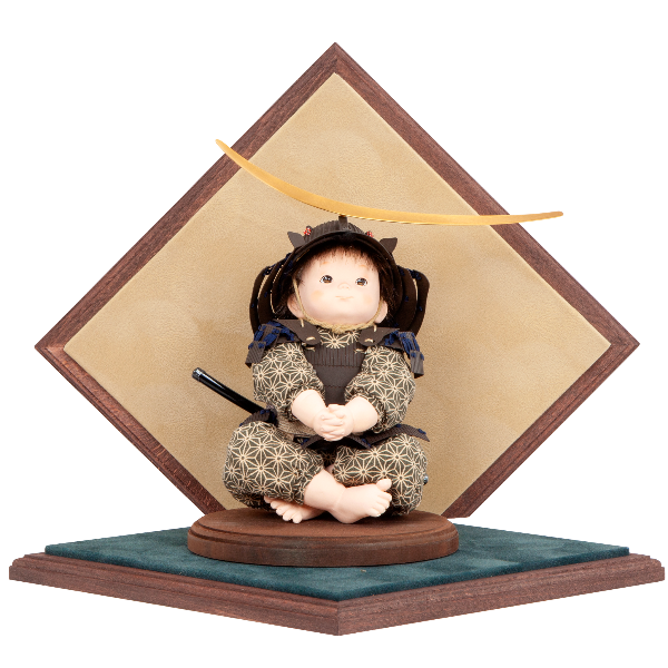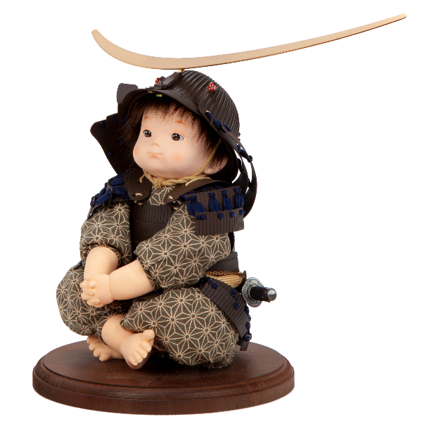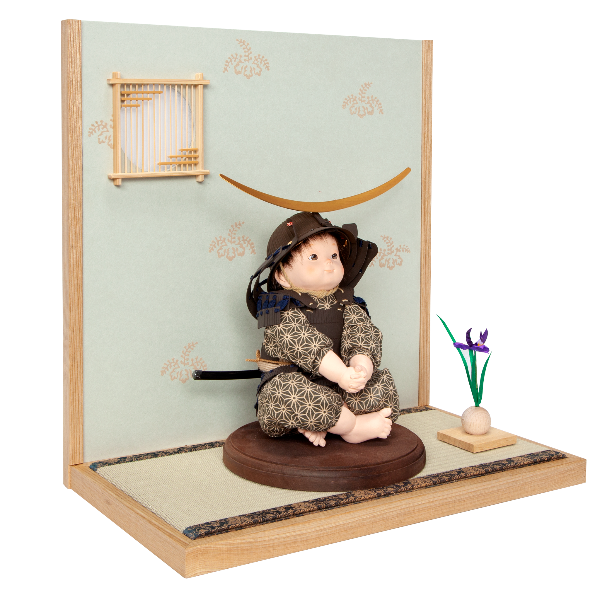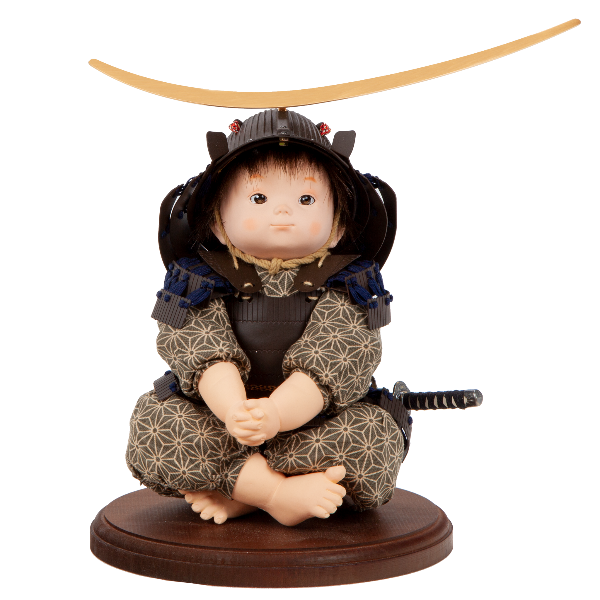 座った姿がとっても可愛らしい壹三作の風雲児。着物は赤ちゃんの産着としても使用され、魔除けの意味もある麻の葉文様を用いました。 微笑む柔らかな表情に、渋い艶消しの鎧を着た、落ち着いた印象の人形です。