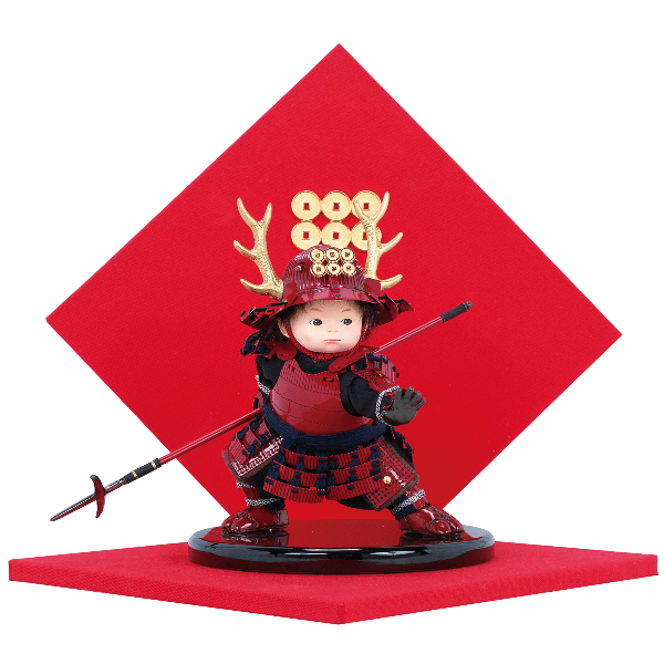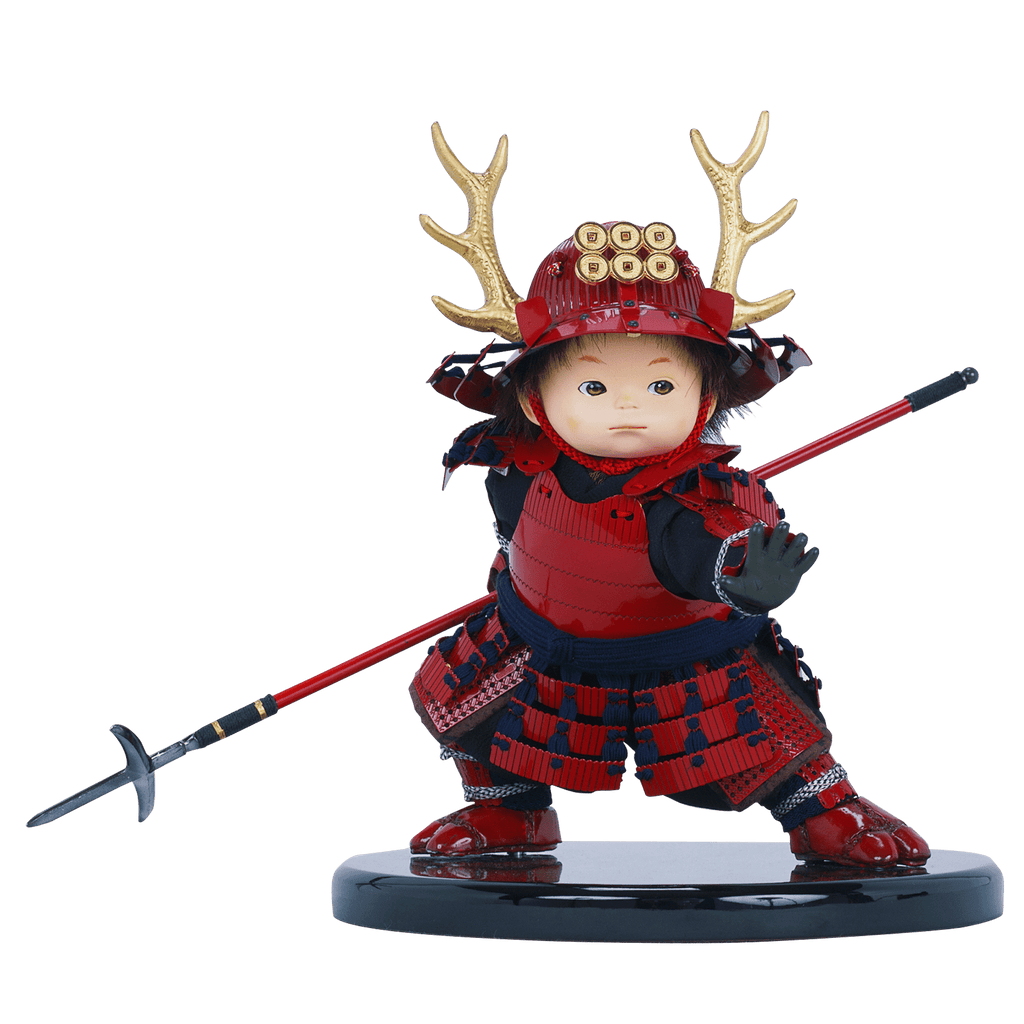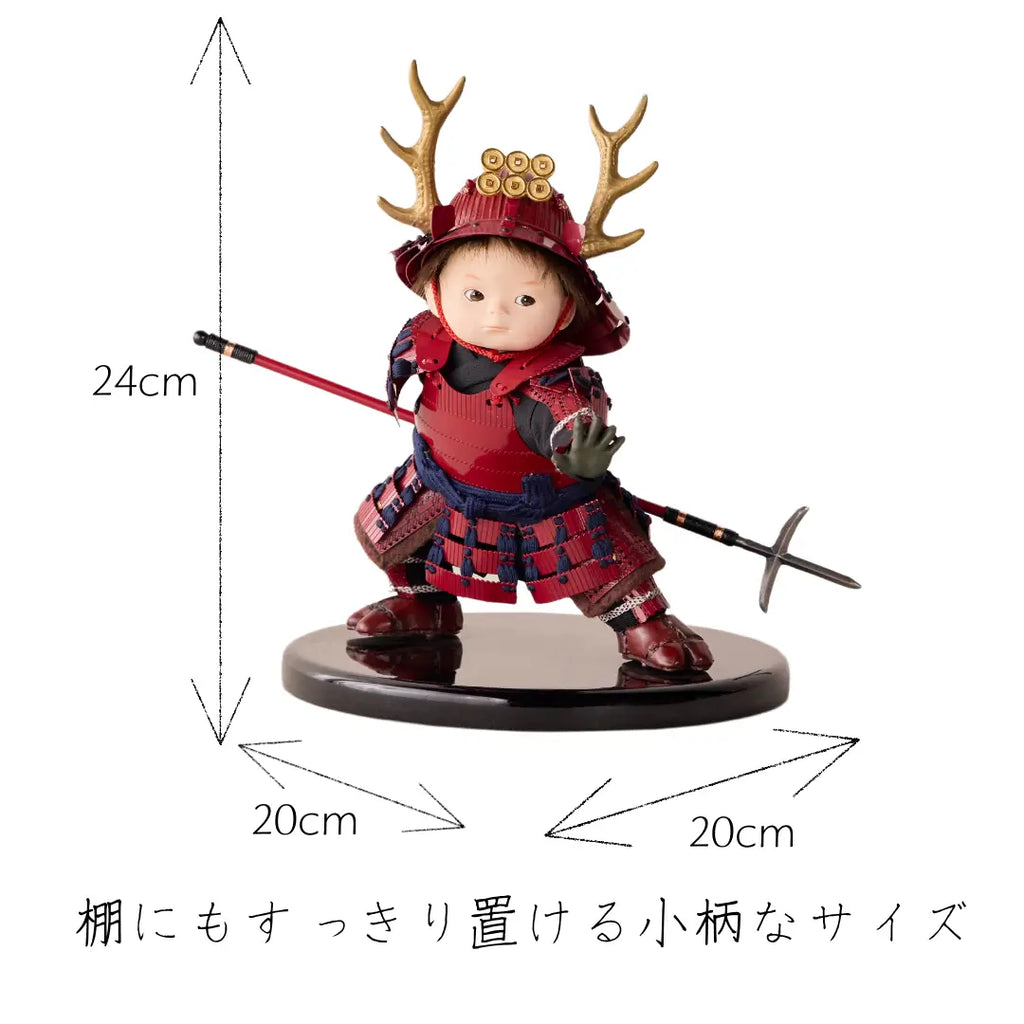 全身を赤一色で統一した「赤備え」の鎧をまとい、兜には大きな鹿角、覚悟の象徴・六文銭を携えた真田幸村モチーフの子ども大将です。歌舞伎の見得を思わせる力強いポーズと、凛とした表情が印象的。書き目で仕上げた瞳や柔らかな造形が、わんぱくさと気高さを併せ持つ節句飾りです。