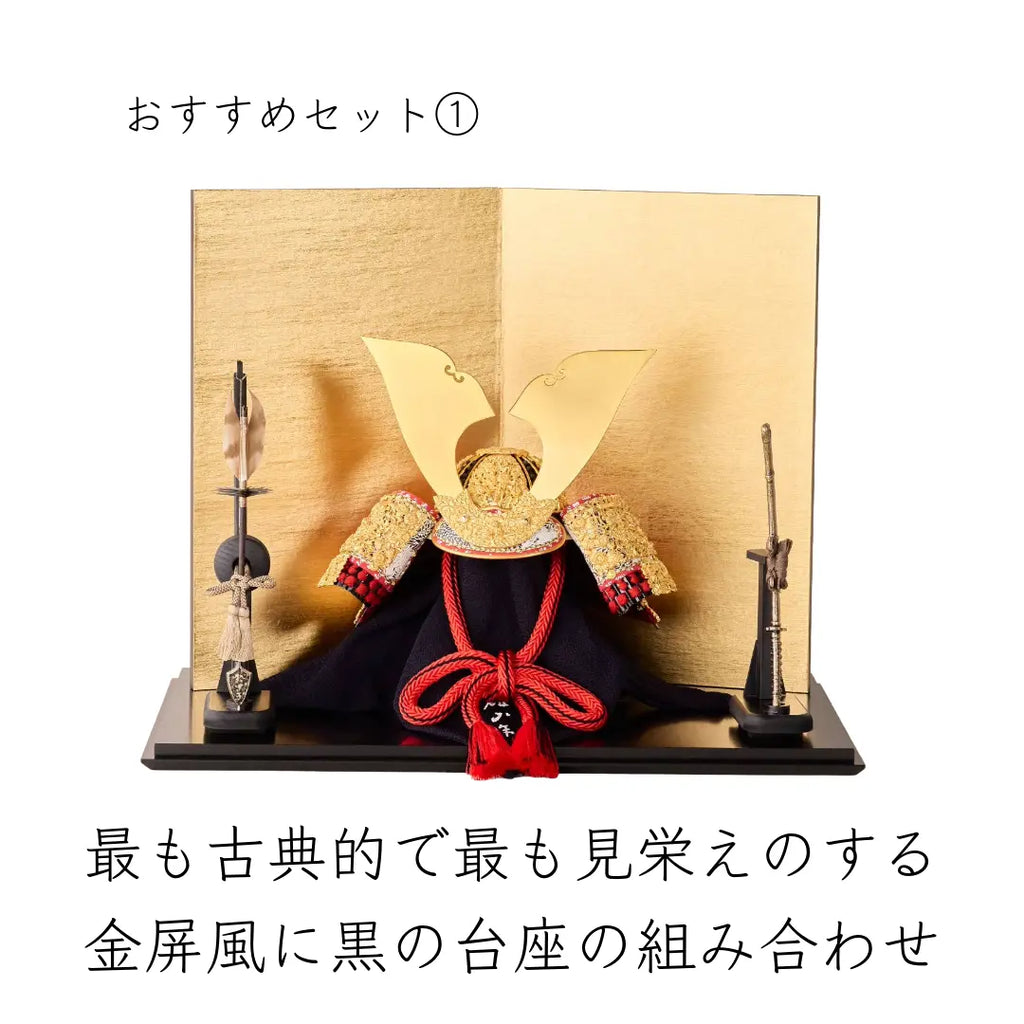 • おすすめセット①:50cm巾の台座に箔押しの屏風を背景にした飾り(弓太刀付)