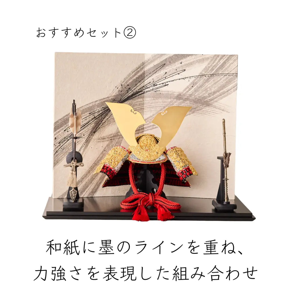 • おすすめセット②:50cmの幅の台座に和紙の屏風を背景にした飾り(弓太刀付)