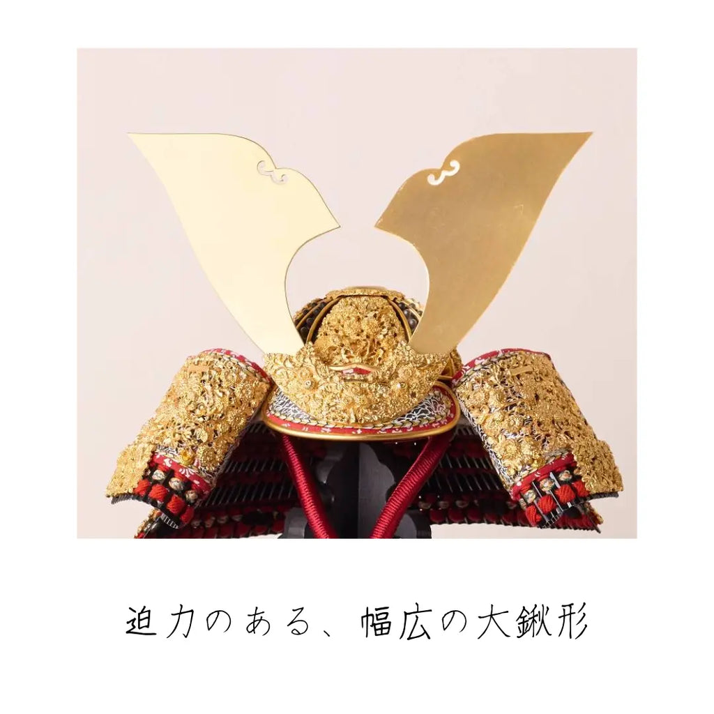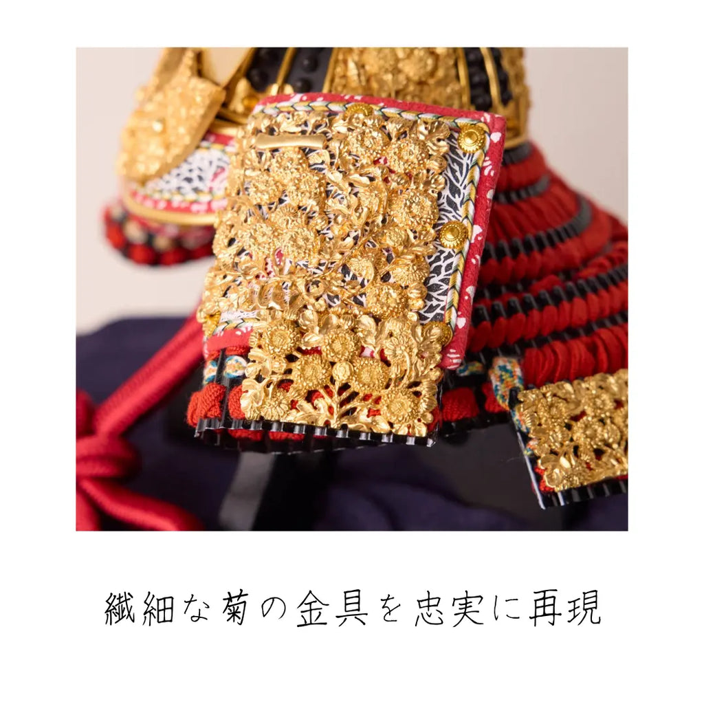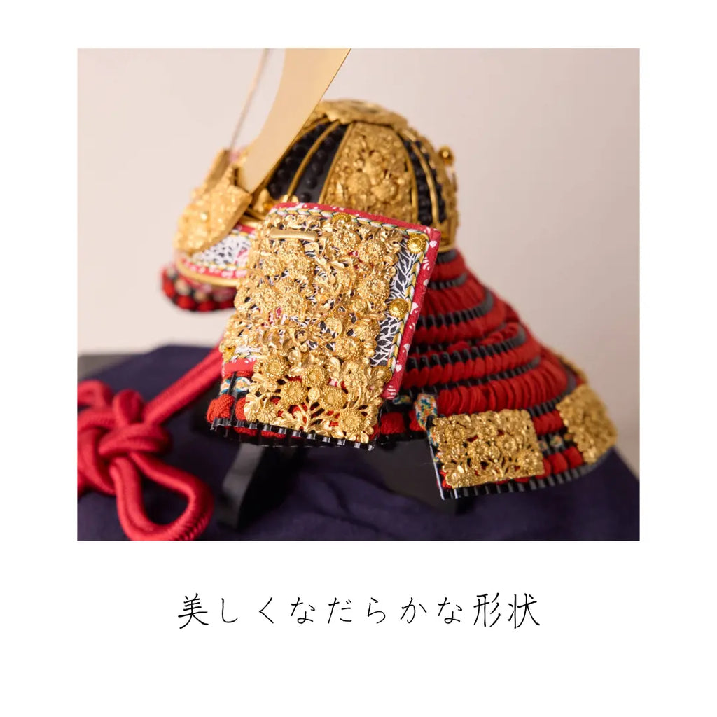 青森県・櫛引八幡宮に奉納される国宝「赤糸威鎧(あかいとおどしのよろい)」を忠実に再現した作品です。 兜と袖に菊一文字の金具を配したことから「菊一文字の鎧兜」とも呼ばれ、古代の金工技術の粋を極めた名品として知られます。 奈良・春日大社所蔵の「竹虎雀飾」と並び、現存甲冑の双璧と称されるこの鎧を、雄山が実地調査をもとに金具や寸法を精密に1/4スケールで模写。