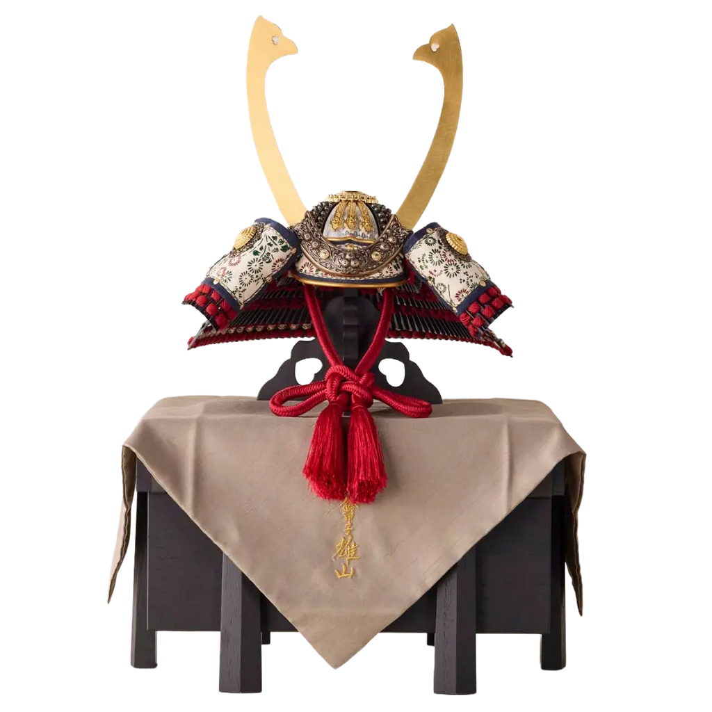 「暁」は、室町時代に隆盛した「笠じころ」の形を基に、鈴甲子雄山が現代に蘇らせた甲冑シリーズです。伝統技法を継承しながらも、洗練された造形と独自の色彩感覚で再構築。その中でも茜は最も古風なバランスで仕立てました。古の気品と現代の美意識が調和した、時代を越えて輝く兜飾りです。